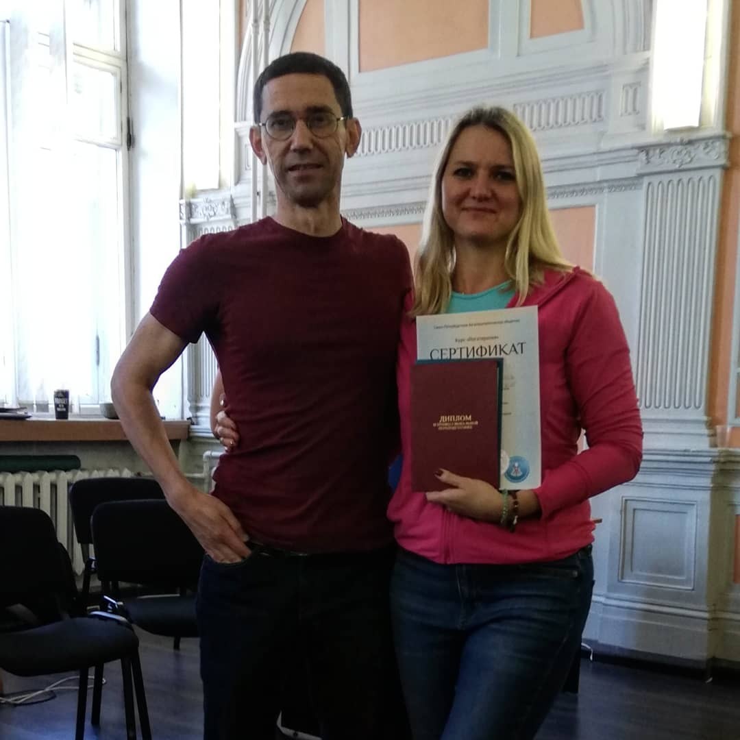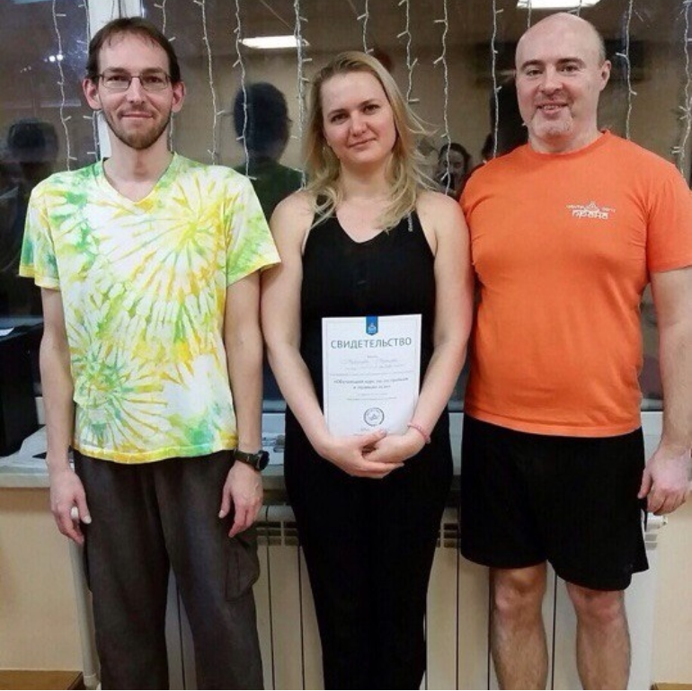 В 2014 году я поехала учиться к Артёму в Санкт-Петербург. Курс был настолько глубокий и информативный, что мой мозг иногда не выдерживал от такого большого количества изученных болезней. В итоге годового изучения патогенезов и этиологий заболеваний, опытов над моими учениками и написанной курсовой работы, сдачи тяжелейших экзаменов, коллеги меня поймут, я получила сертификат, а позже, в 2019 году, диплом по адаптивной физической культуре и удостоверение о повышении квалификации по йогатерапии.