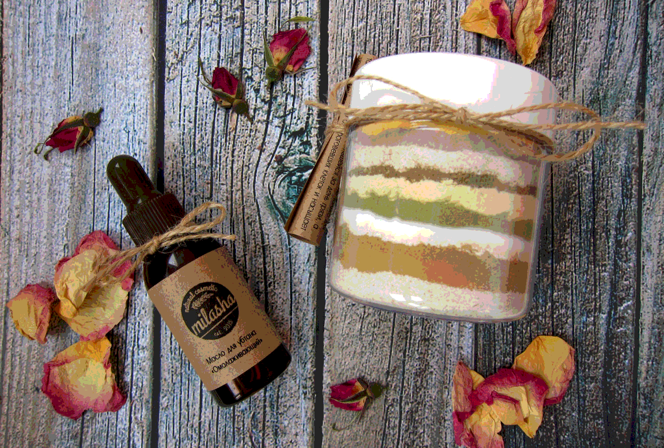 Состав: мука овсяная и машевая, солодка, валериана, ромашка, имбирь, кардамон, корица, белая косметическая глина.